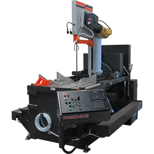 The V140 and VT140HM-60-CTS band saws vary from a vertical blade orientation on the V140 to a forward-canting blade on the VT140 version. The touch screen control, mounted in a swing-away console, allows the operator to enter an angle and the arm will travel to that position and stop.