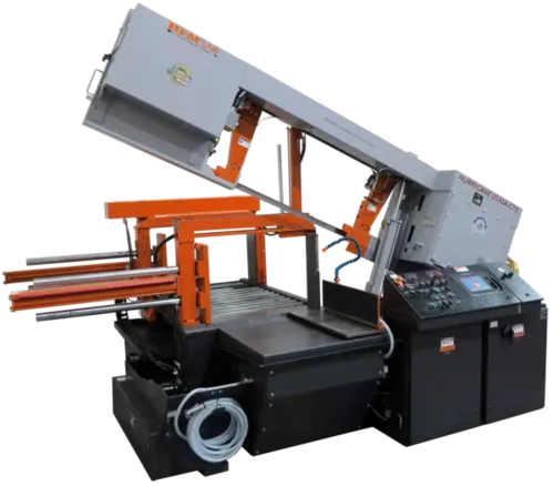 The Hurricane 2030A-CTS band saw allows programmable miter cuts up to 60ᵒ in one direction. A touch screen control is mounted in a swing-away console for settings, operational functions, and diagnostics. The control allows manual, semi-automatic or automatic cutting. A chip auger and Cut Watcher® are included.