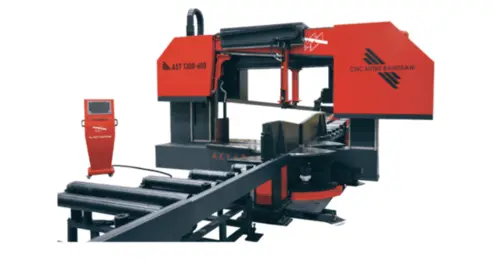 The AST band saws are engineered for automatic, high precision cutting with the capability of miter cutting up to 45 degrees left and 60 degrees right, ensuring exceptional cutting capabilities for various materials with adjustable speeds and angles.