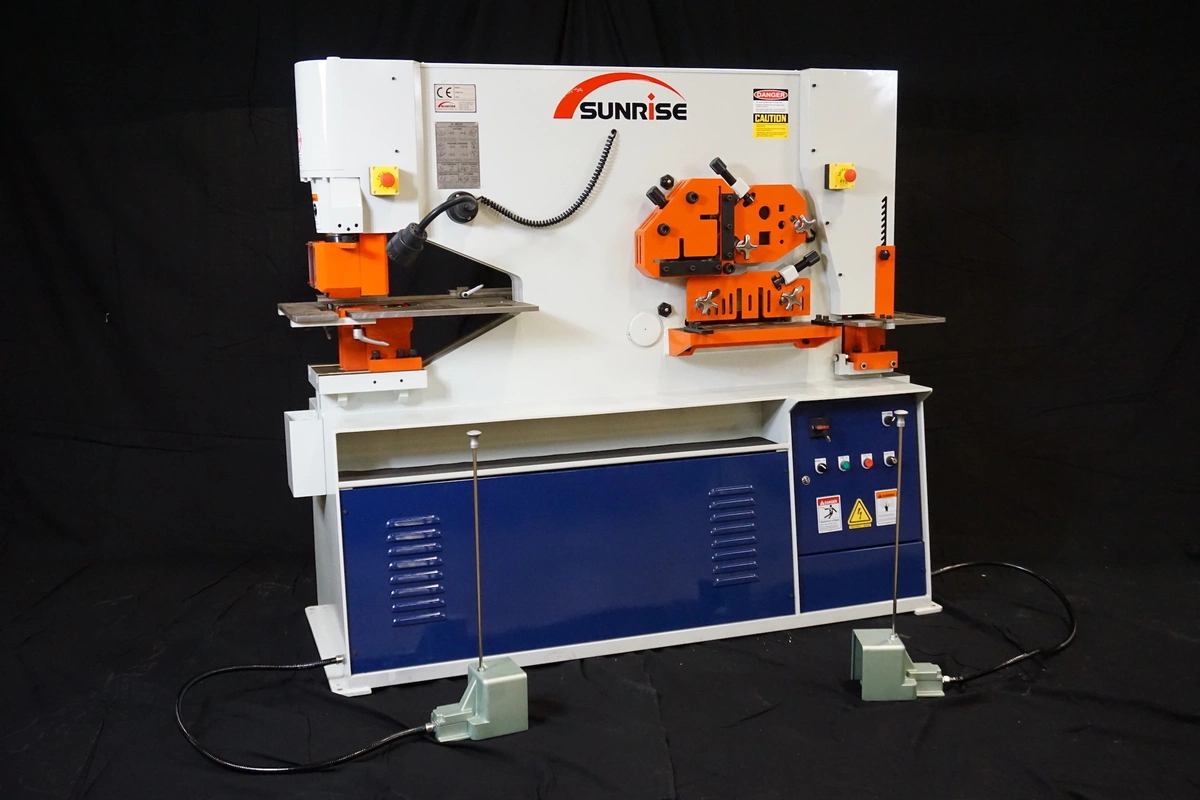 SUNRISE Model IW Dual Cylinder Ironworkers range in capacities from 66 Tons to 185 Tons and feature two High-Speed cylinders with two-position foot pedals. The dual-cylinder series ironworkers are built with the SUNRISE tradition of well engineered products for high power, quality and reliability at an incredible price.