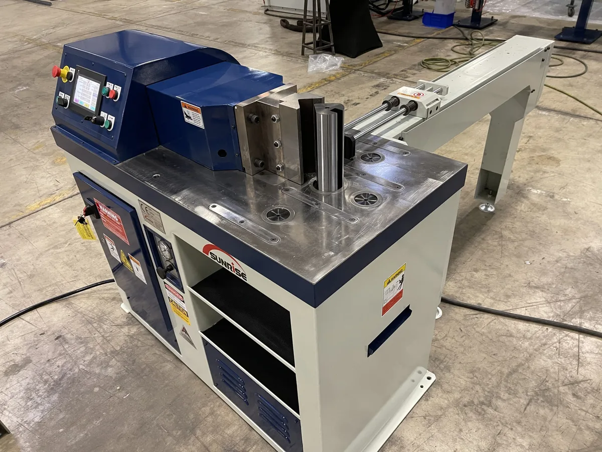 The SUNRISE CNC back gauge extends the accuracy and efficiency of the HBM series horizontal bending machines. Available in both 1m and 2m configurations. This optional equipment includes a larger enhanced touch screen control. The CNC back gauge is accurate to ±0.004″ and when combined with the digitally controlled cylinder travel, achieves complex bending work with ease. The CNC back gauge can be programmed to slightly retract immediately before bending to prevent damage from material movement. Control memory can store up to 99 programs with 10 bends each for quick and easy programming of a lot of different jobs.