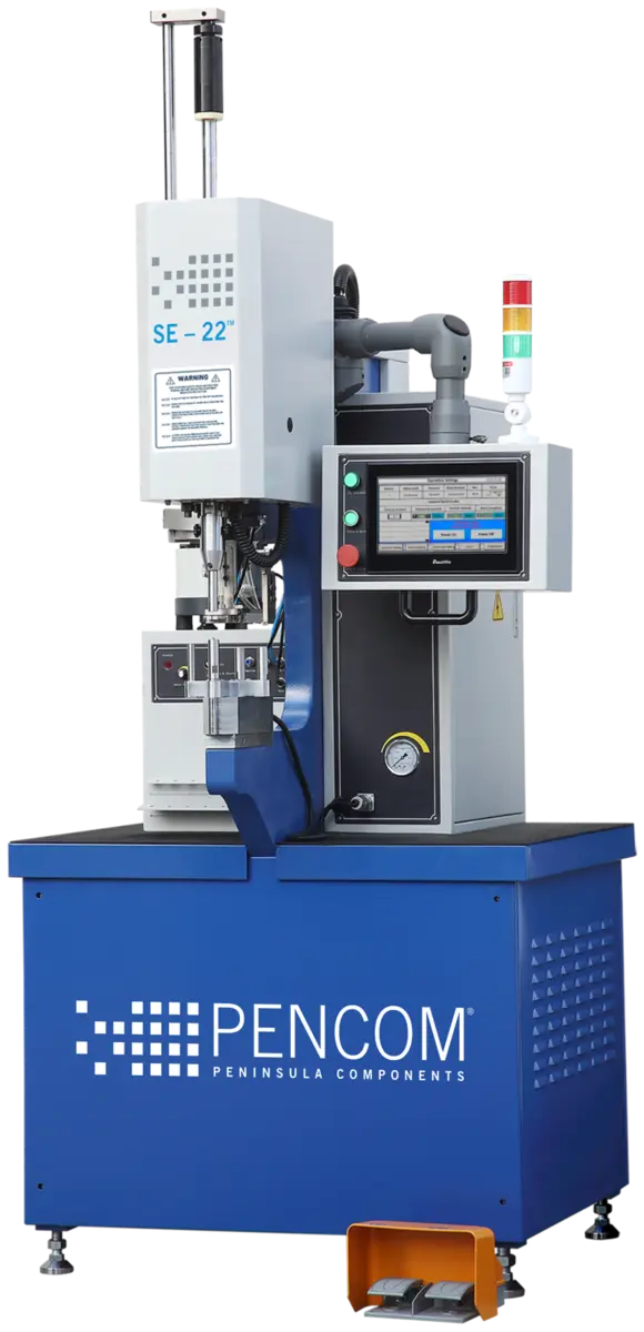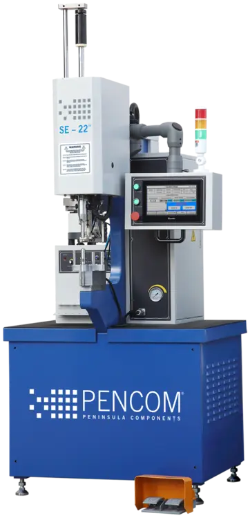 The SE-22™ is the pinnacle of the SE series. While retaining the uniform 6 tons of pressure, 18 inch (457mm) throat depth, 2-56 (M2) to 3/8-16 (M10) fastener sizes, and operator safety system, it boasts advanced elements, such as the Automatic Turret Insertion System, and a 10-inch touch screen capable of storing up to 200 customized programs and fastener databases. This machine is designed for businesses requiring top-tier fastener insertion capabilities.